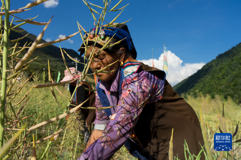 四川省阿壩藏族羌族自治州金川縣二普魯村,村民在收割油菜(8月24日攝)。新華社記者 唐文豪 攝