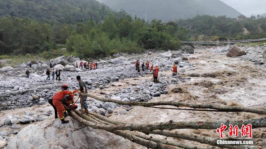 群眾和森林消防員正在搭建簡(jiǎn)易過河木橋。四川森林消防供圖 攝