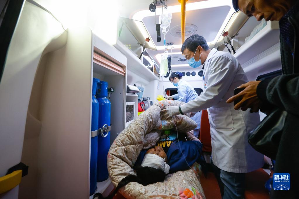 9月5日晚,在四川甘孜州瀘定縣磨西鎮(zhèn)的受災群眾臨時安置點,人們轉運受傷群眾。新華社 沈伯韓 攝