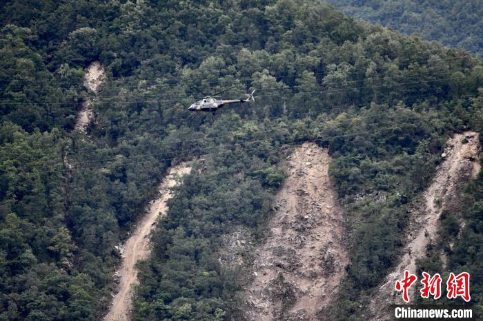 救援直升機轉運傷員,山體垮塌痕跡赫然可見。張浪 攝