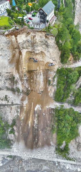 貢都回頭曲線處,2萬(wàn)余立方米的塌方體將公路掩埋,一人高的石塊比比皆是。幾臺(tái)挖掘機(jī)、裝載機(jī)各司其職,揮舞鐵臂,將石塊、木塊、泥塊盡數(shù)推開(kāi)。