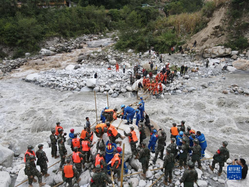 9月7日,在雅安市石棉縣王崗坪彝族藏族鄉(xiāng)幸福村二組,村民與消防救援隊員搬運直升機送來的水和食物。新華社記者 才揚 攝