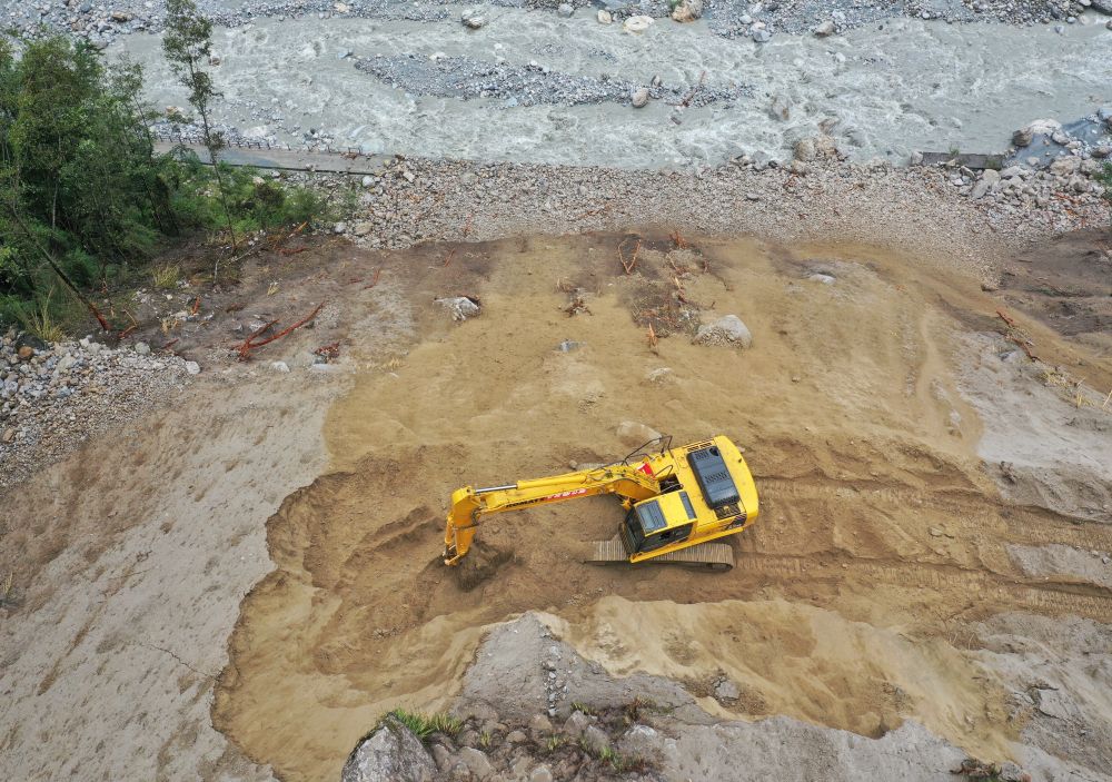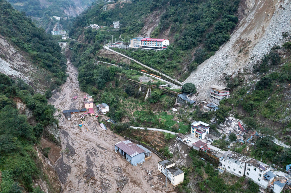 9月7日,在磨西鎮(zhèn)附近,四川路橋的工作人員在搶修通往海螺溝景區(qū)的道路(無人機(jī)照片)。