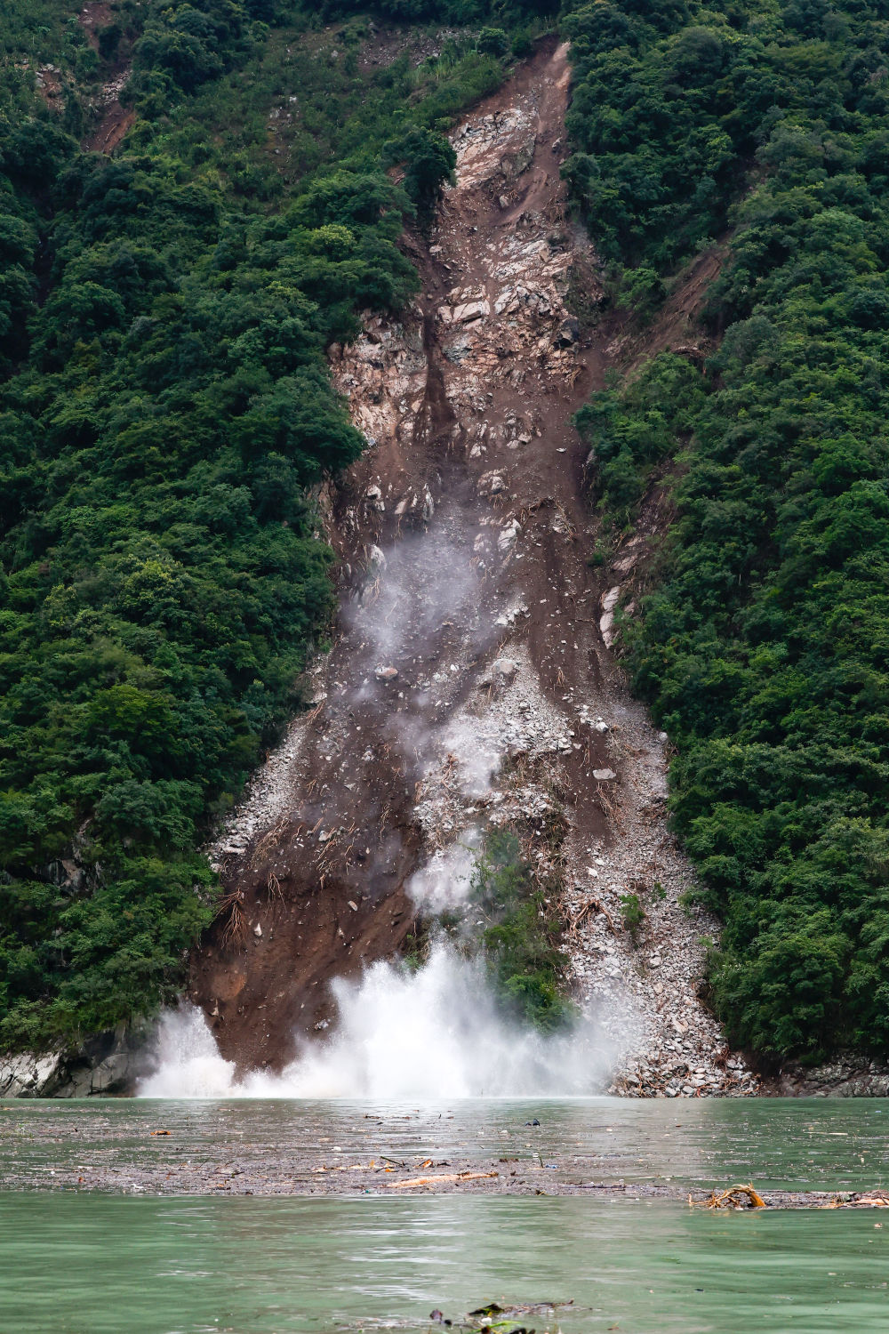 從聯(lián)合村隧道口下到山腳下,是一個(gè)臨時(shí)碼頭。因?yàn)榈刭|(zhì)、道路等條件所限,救援力量只能從這里乘坐橡皮艇,沿水路行至上圖那個(gè)山谷口附近,登陸后沿山路上行,翻過紅花崗再下行才能進(jìn)入灣東村。坐在橡皮艇里,時(shí)不時(shí)還能看到河畔被地震破壞的山體仍在不停滾下落石,巨大的聲響回蕩在大渡河上空。