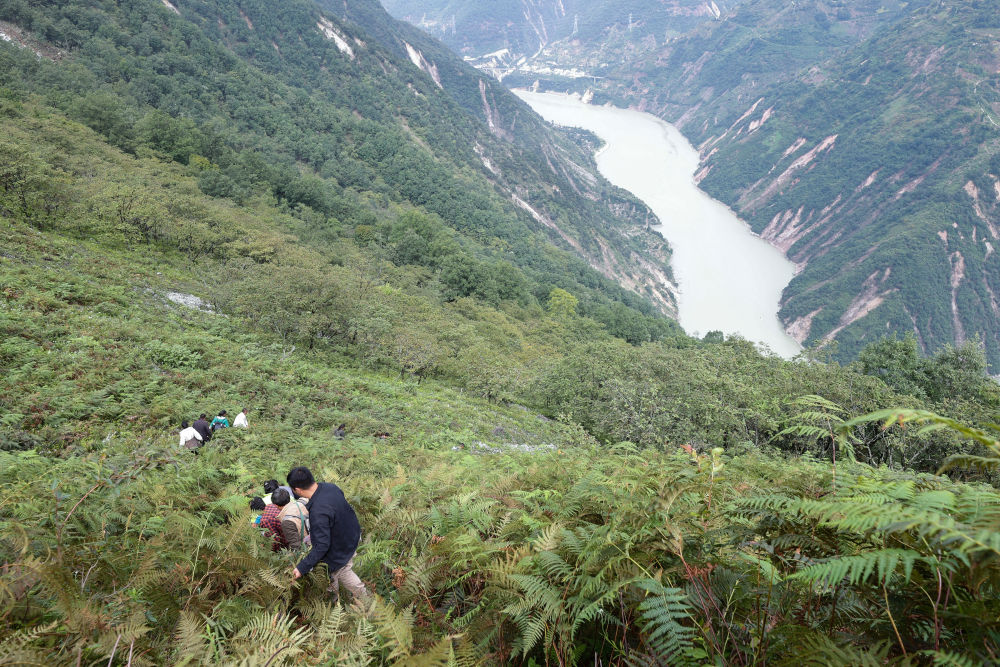 熟悉地形的村民在前帶路。其實(shí)毫無“路”可言,我和救援人員只能沿著依稀可辨的足跡向上攀爬。山高陡峻,時(shí)不時(shí)會(huì)遇到山體傾斜角度大于60度的路段,只能手腳并用才能上去。為了減輕負(fù)重,我把巧克力這樣的補(bǔ)給都放在了山下,只帶了一瓶水在身上。很快,滿頭大汗,汗水流入眼睛刺得生疼。抬頭望著遙遠(yuǎn)的需要翻越的山頭,對(duì)體力和耐性都是巨大考驗(yàn)。一些救援人員因?yàn)楣ぷ餍枰?,還背著很重的繩子,辛苦程度可見一斑。