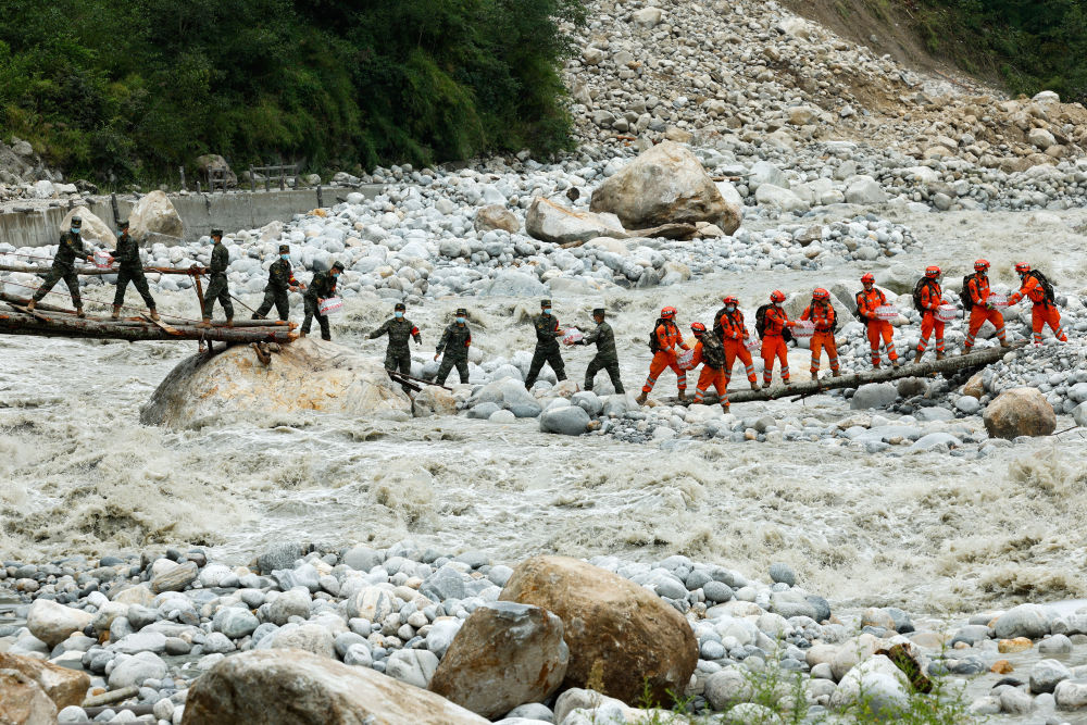9月8日,在磨西鎮(zhèn)附近,救援人員站在臨時(shí)架設(shè)的小橋上向河對(duì)岸的村民運(yùn)送生活物資。