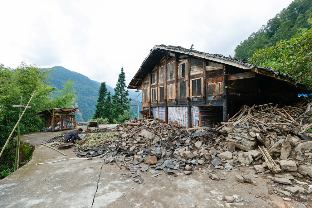 9月8日,共和村一組被地震損壞的民房。旁邊坍塌的山體本是盤山公路,如今已隱入山中不復(fù)存在。