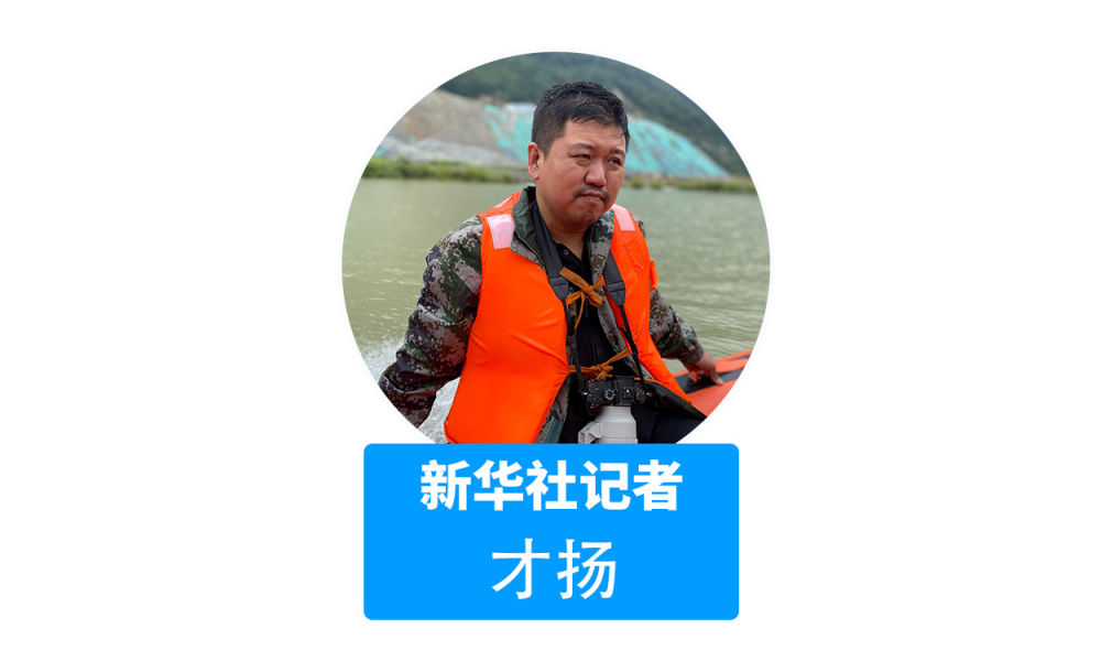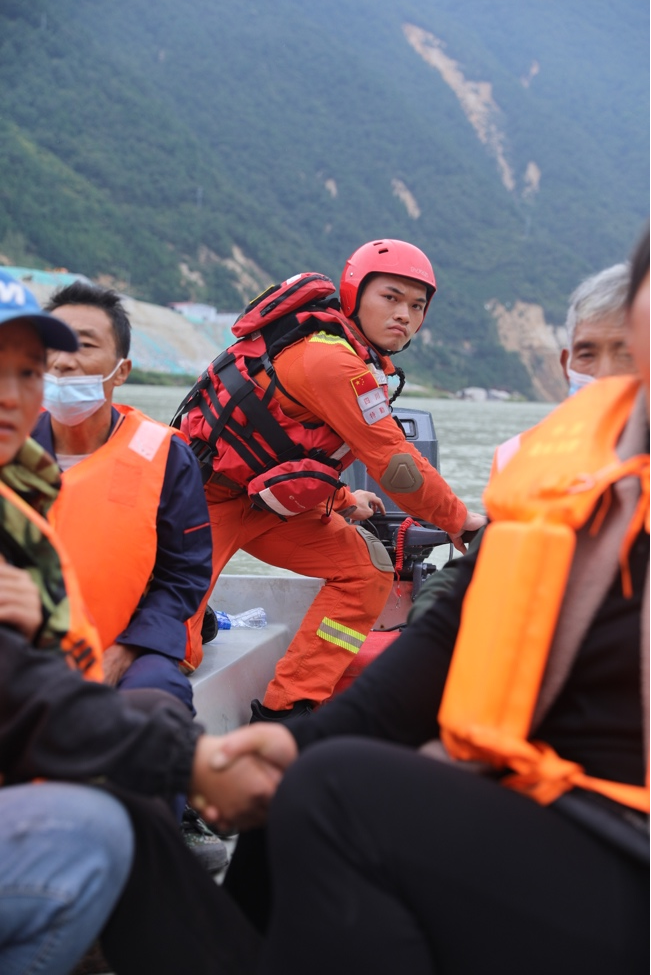 大渡河水奔涌流去,但穿梭于各個(gè)村莊間的救援人員毫無畏懼。我們隨救援人員一起坐上沖鋒舟,兩岸的山上不斷有滾石滑落。