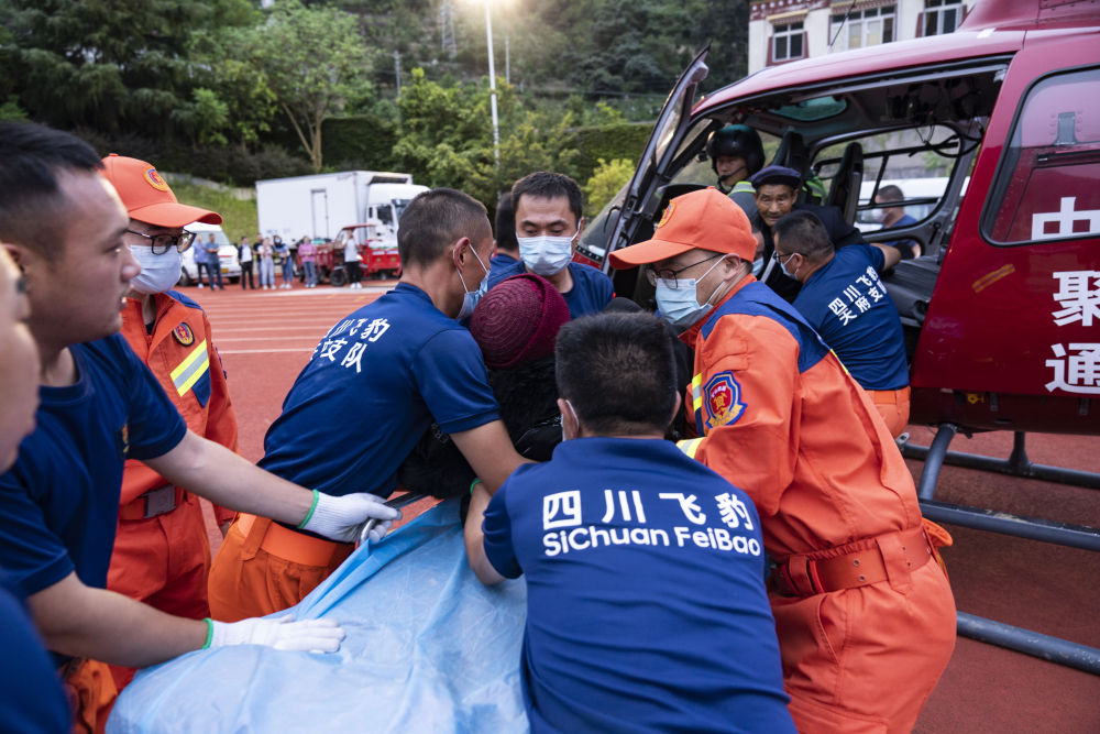 9月6日,在石棉縣中學(xué)的臨時(shí)起降點(diǎn),救援人員在運(yùn)送一名從石棉縣幸福村轉(zhuǎn)運(yùn)來的受傷老人。