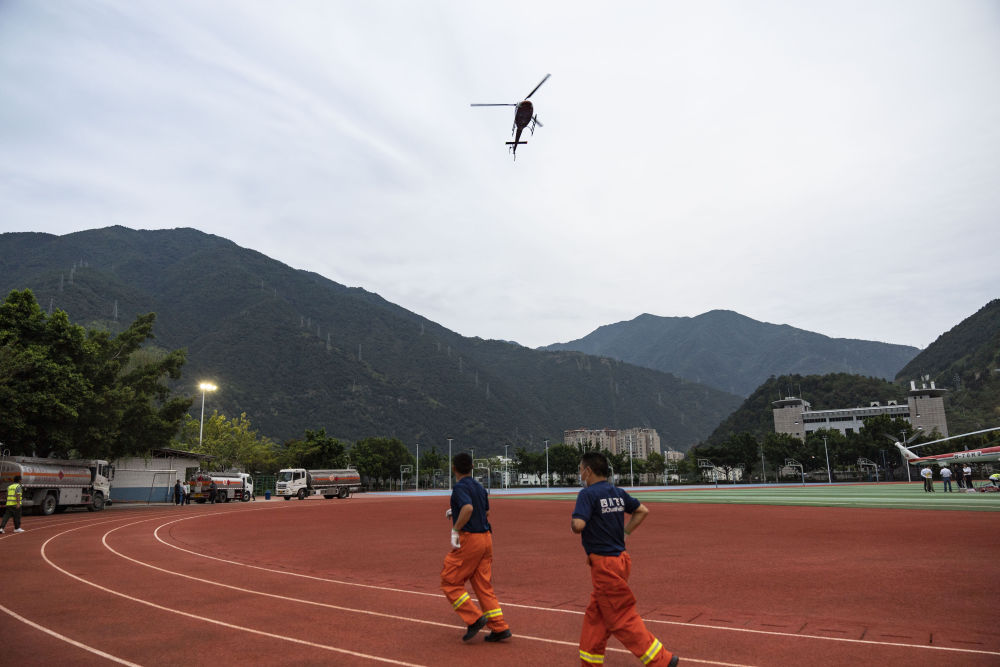 9月6日,在石棉縣中學(xué)的臨時(shí)起降點(diǎn),應(yīng)急管理部南方航空護(hù)林總站救援直升機(jī)在降落。