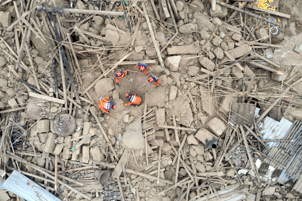 9月7日,在幸福村二組,四川眉山消防救援隊(duì)隊(duì)員幫助村民在倒塌的房屋中找尋物品(無人機(jī)照片)。