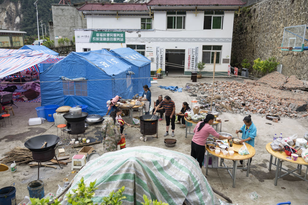 9月7日,在草科鄉(xiāng)政府安置點(diǎn)內(nèi),當(dāng)?shù)厝罕娫跍?zhǔn)備午飯。