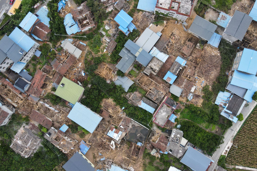 這張拍攝于9月6日的照片顯示石棉縣王崗坪鄉(xiāng)部分老舊房屋倒塌(無人機(jī)照片)。