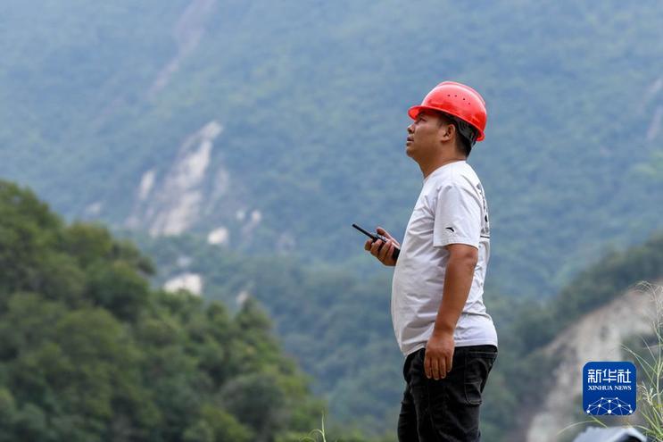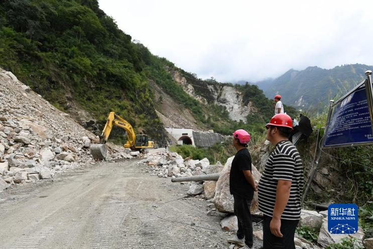 9月8日,王繼剛在幫清理道路落石的隊員觀察山上落石。新華社記者 胥冰潔 攝