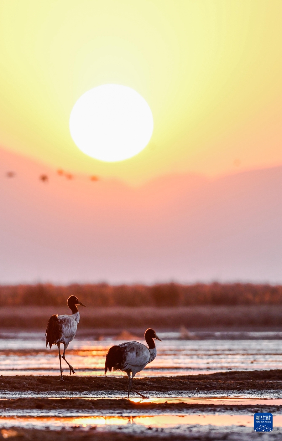 在貴州草海國(guó)家級(jí)自然保護(hù)區(qū)迎著朝陽(yáng)起飛的黑頸鶴(2021年1月13日攝)。新華社記者 楊文斌 攝