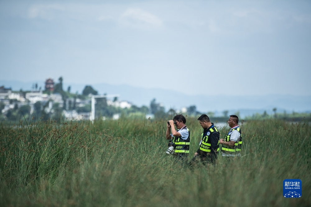 貴州草海國(guó)家級(jí)自然保護(hù)區(qū),草海巡護(hù)隊(duì)副大隊(duì)長(zhǎng)劉廣惠(左一)和隊(duì)員在日常工作巡護(hù)中(2021年7月8日攝)。新華社記者 陶亮 攝