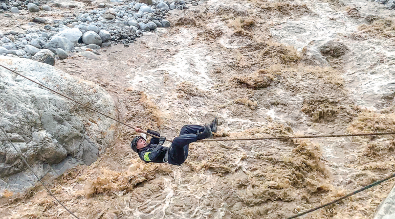 焦慮之際,另一組隊(duì)員沿河搜尋發(fā)現(xiàn)一塊離河對岸較近的巨石,率先過河的戰(zhàn)友打錨點(diǎn)接應(yīng),很快在兩邊架起一座“飛索橋”,曾經(jīng)當(dāng)過高山向?qū)У耐跞f銳第一個(gè)沖上去,四肢倒掛,背對激流,飛快移向?qū)Π?。緊接著,隊(duì)員沙馬澤呷躍上飛索。鋼索和飛索兩路同時(shí)過河,隊(duì)伍很快全部來到對岸。