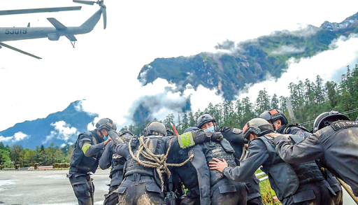 “9·5”地震發(fā)生前兩周,特警支隊(duì)舉行了一次警務(wù)技能大比武。比武科目包括高海拔山地武裝奔襲、簡易擔(dān)架制作、傷員應(yīng)急處理、傷員轉(zhuǎn)運(yùn)、結(jié)繩……兩周后,他們來到另一個(gè)比武場,這一次是與死神較量。