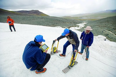 在格拉丹東雪山,科考隊(duì)員使用地質(zhì)雷達(dá)探測(cè)冰川。