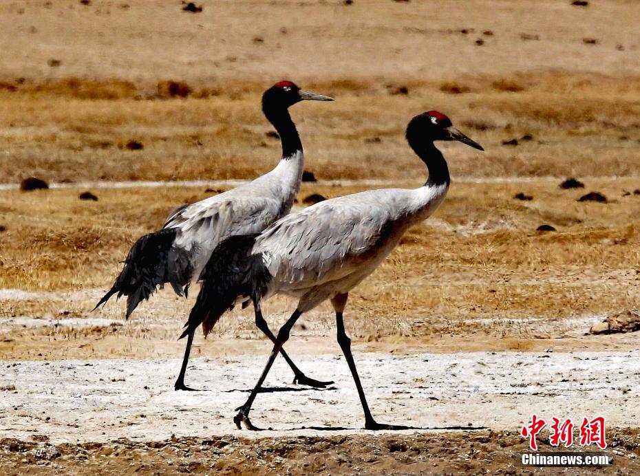 圖為一對(duì)黑頸鶴在草地上散步。才讓扎西 攝