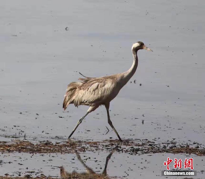 圖為一只灰鶴在湖中散步。才讓扎西 攝