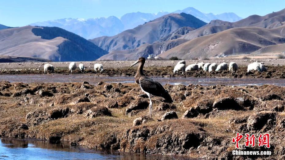 高原深秋,在祁連山國家公園青海片區(qū)的祁連縣阿柔鄉(xiāng)的一片沼澤地,攝影師拍到了一只成年黑鸛。畫面中,黑鸛在祁連縣阿柔鄉(xiāng)的一片沼澤地里覓食休憩,時而在羊群牛群中飛翔穿梭,仿佛在幫牧人“放牧”。包雷 攝