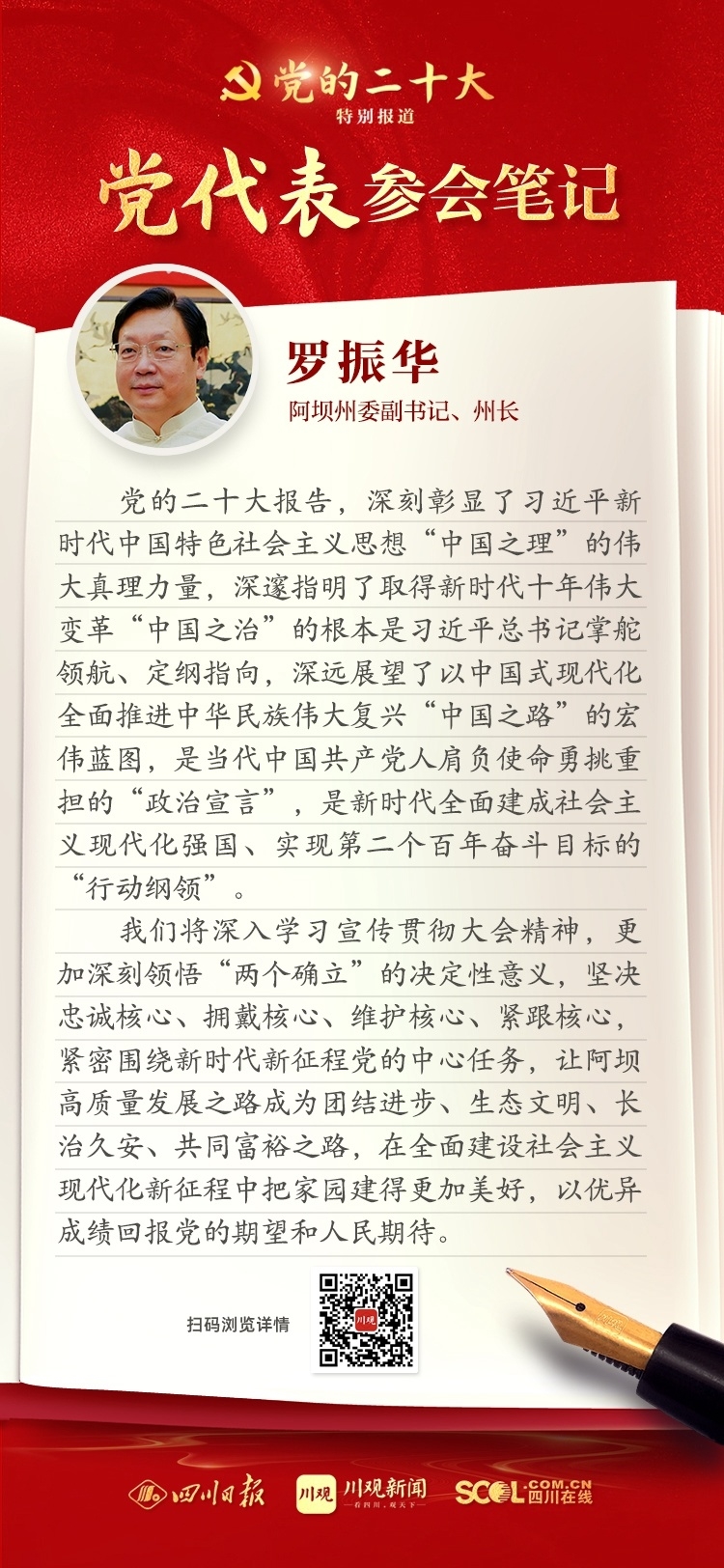 出席盛會,來自四川的黨代表深感使命光榮、責(zé)任重大,大家認(rèn)真履職,結(jié)合報(bào)告談?wù)J識、談體會、談打算。川觀新聞特此推出“黨代表參會筆記”欄目,分享黨代表們的參會心得,敬請垂注。
