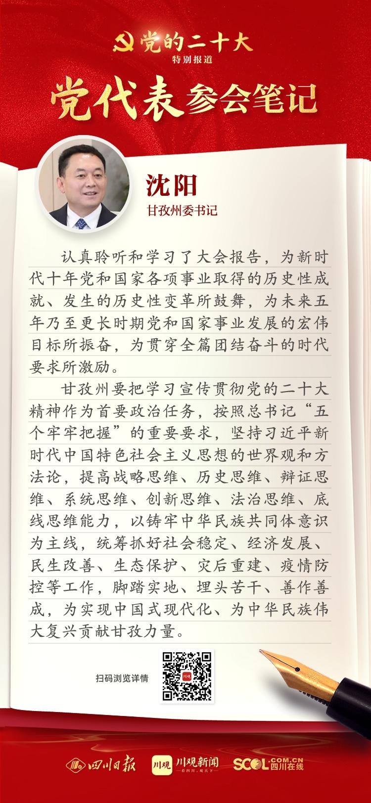 出席盛會,來自四川的黨代表深感使命光榮、責(zé)任重大,大家認(rèn)真履職,結(jié)合報告談?wù)J識、談體會、談打算。川觀新聞特此推出“黨代表參會筆記”欄目,分享黨代表們的參會心得,敬請垂注。
