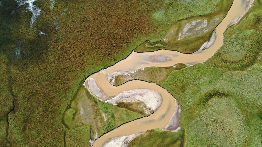 游客在甘肅省甘南藏族自治州瑪曲縣河曲馬場的濕地游覽(2019年6月22日攝,無人機(jī)照片)。新華社記者 陳斌 攝
