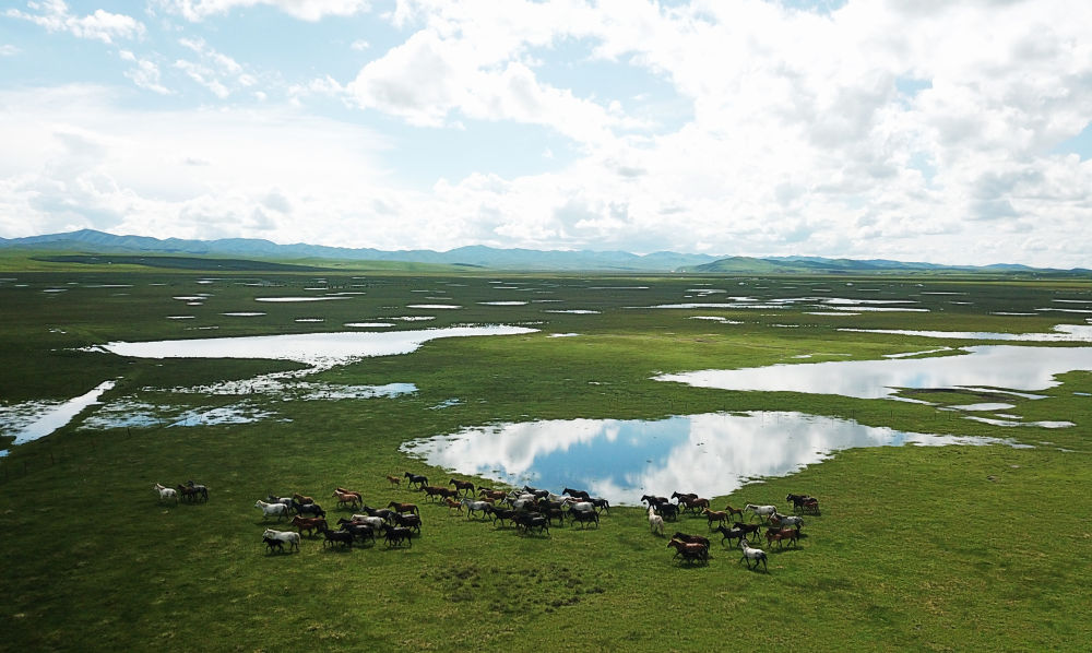 河曲馬在甘肅省甘南藏族自治州瑪曲縣河曲馬場的濕地奔跑(無人機(jī)照片)。新華社記者 陳斌 攝