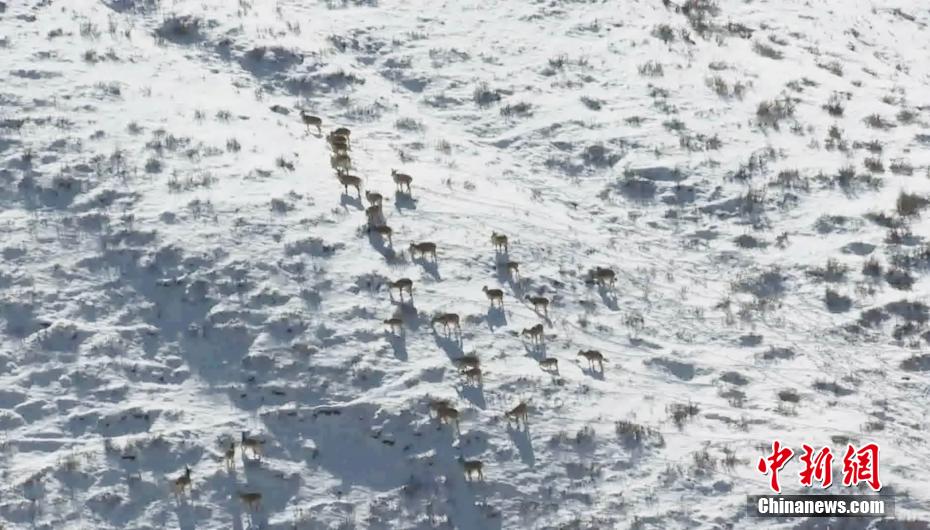 圖為巖羊群在雪地里覓食。 烏蘭縣融媒體中心 供圖