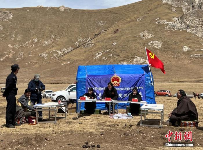資料圖為“馬背法庭”工作人員在牧民帳篷旁辦案。 中新社發(fā) 瑪多縣人民法院 供圖