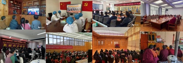 圖為青海省黃南州同仁市各地干部群眾一起收看黨的二十大開幕式,學(xué)習(xí)黨的二十大精神 圖片來源:同仁組工微信公眾號圖片拼合