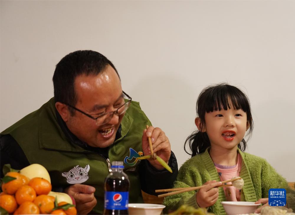 1月14日晚,管護(hù)員們在一起吃餃子。新華社記者 周盛盛 攝