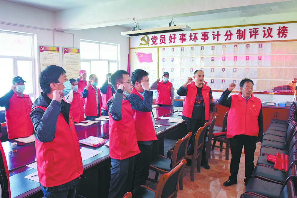 海晏縣金灘鄉(xiāng)東達(dá)村黨支部黨員面向黨旗宣誓。