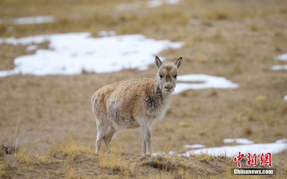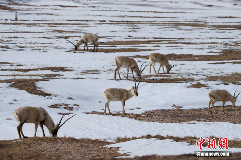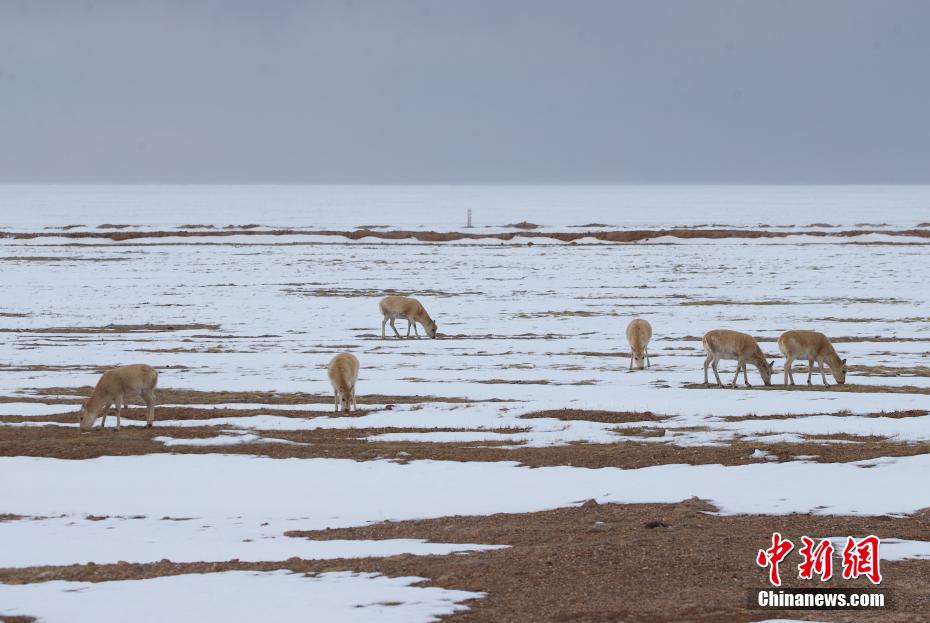 日前,可可西里地區(qū)降下春雪,在109國道五道梁附近,成群的藏羚羊在道路兩旁覓食、棲息,自由愜意。