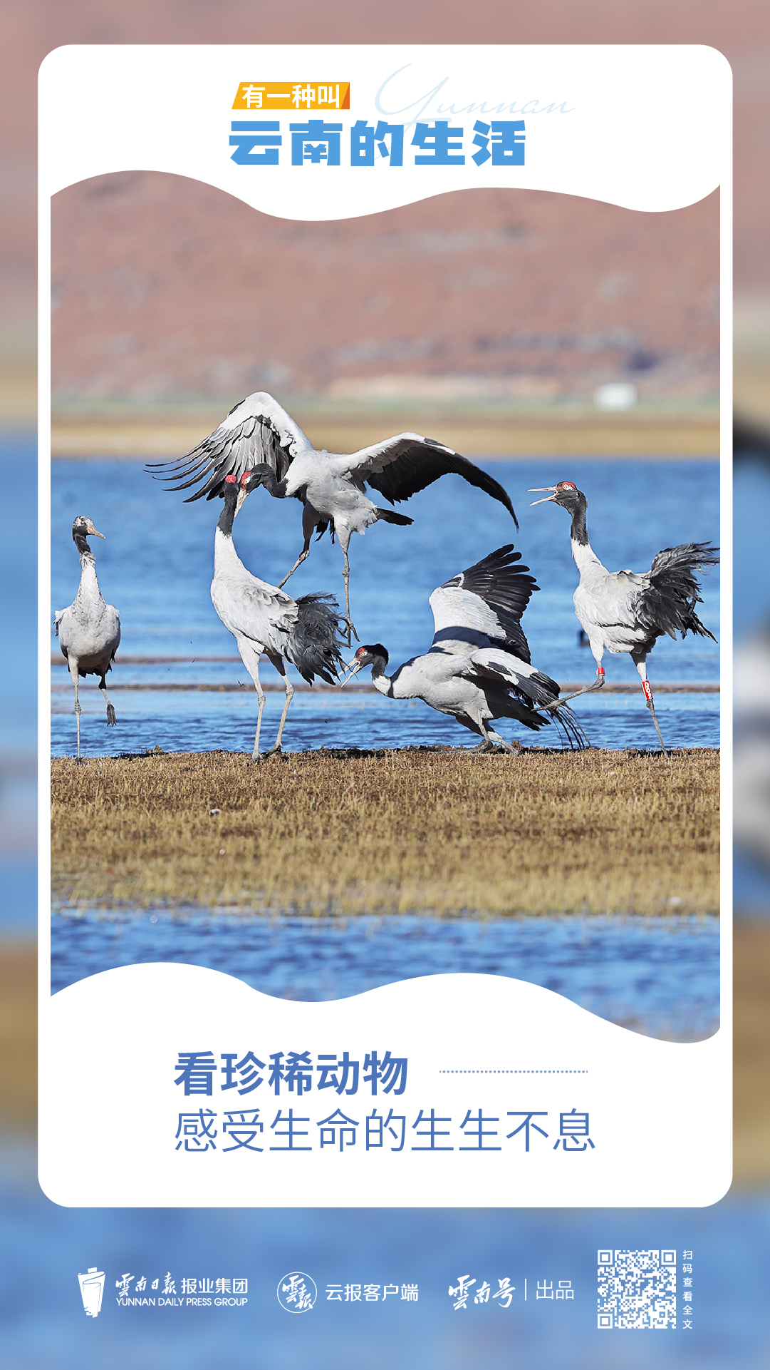 冬季,黑頸鶴和秋沙鴨在眼前散步