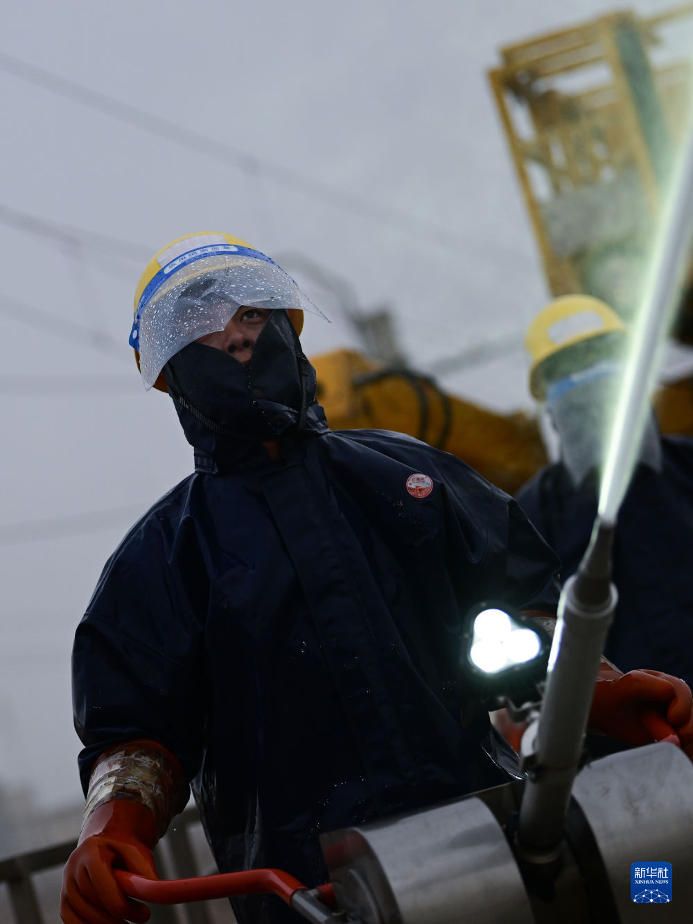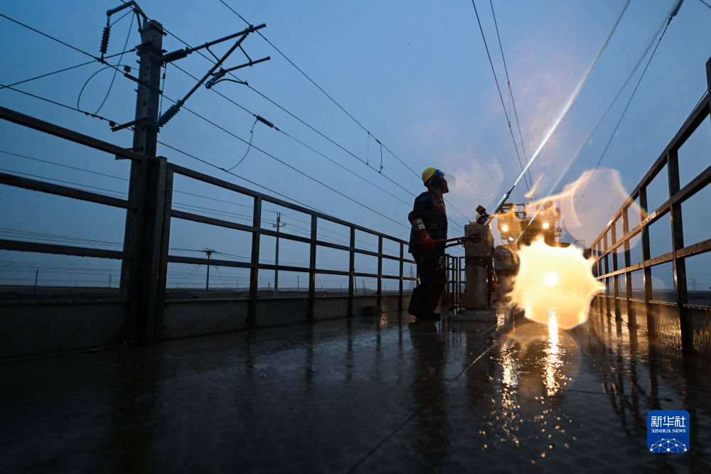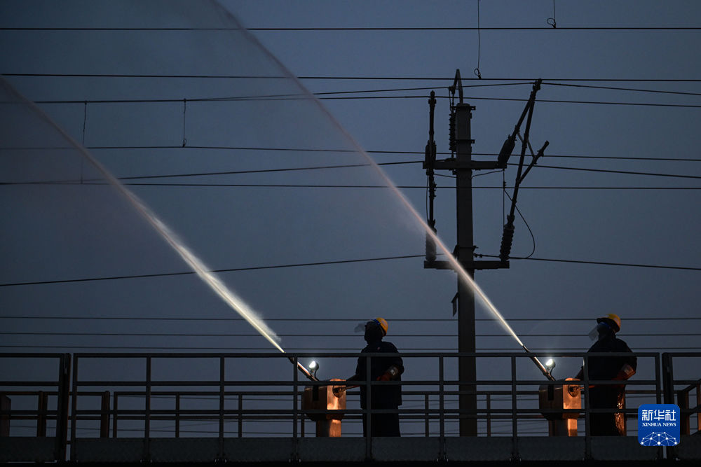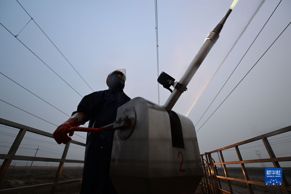 4月20日,中國鐵路青藏集團有限公司西寧供電段格爾木大修車間大修網(wǎng)工區(qū)檢修工使用高壓沖洗水槍對絕緣子設備進行清洗。新華社記者 張龍 攝