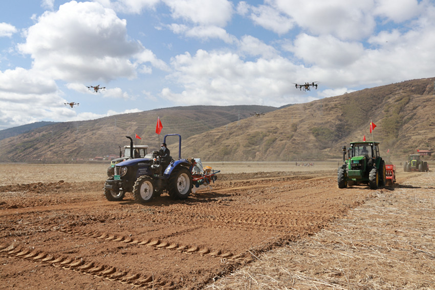 圖為農(nóng)牧民使用現(xiàn)代化農(nóng)業(yè)機械設(shè)備進行春耕