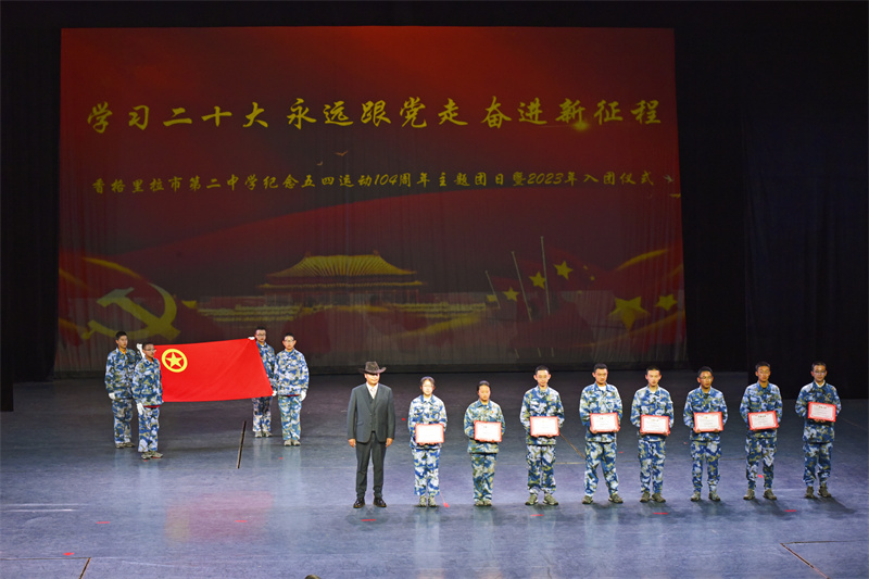 在文藝匯演前,學(xué)校為8位優(yōu)秀團(tuán)員頒發(fā)證書,并舉行了紀(jì)念五四運(yùn)動(dòng)104周年主題團(tuán)日暨2023年入團(tuán)儀式,65名新團(tuán)員佩戴團(tuán)徽莊嚴(yán)宣誓。