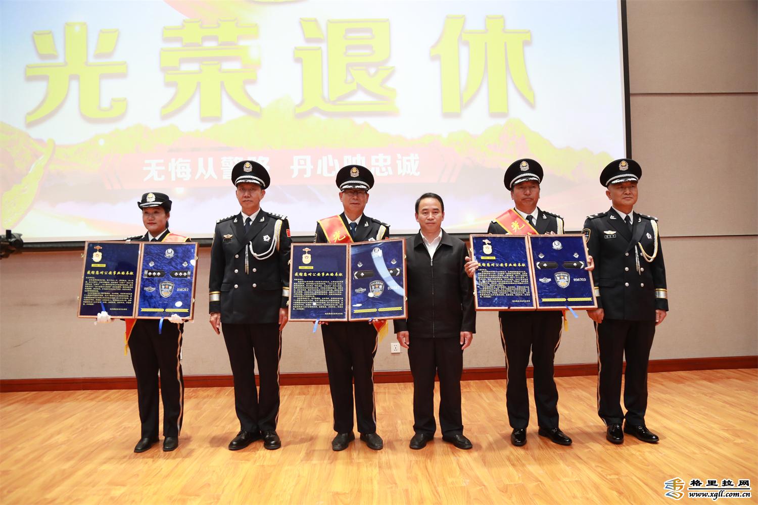 伴隨著陣陣掌聲,4名同志在全體民、輔警的見(jiàn)證下,徐徐入場(chǎng)。榮譽(yù)退休儀式伴隨著激昂嘹亮的《義勇軍進(jìn)行曲》拉開(kāi)帷幕。
