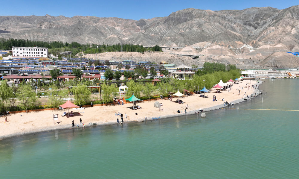 5月13日,游客在黃河上游尖扎段岸邊游玩(無人機(jī)照片)。新華社記者 張宏祥 攝