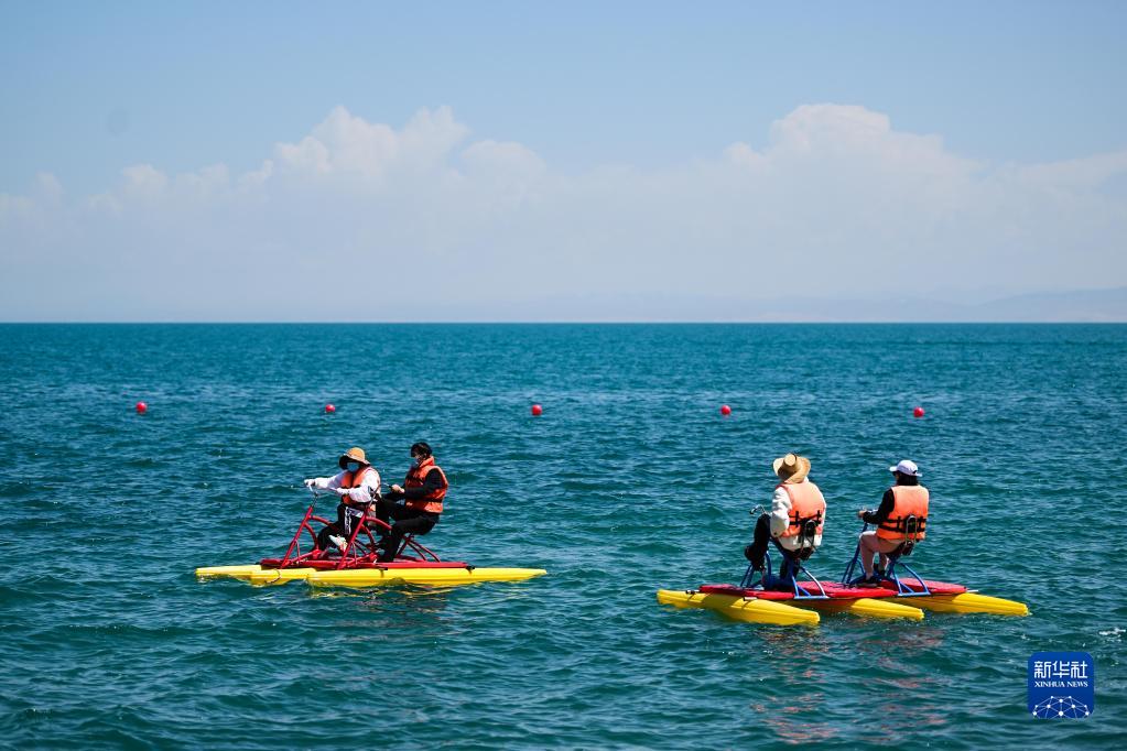 5月18日,在青海湖二郎劍景區(qū),游客在體驗(yàn)水上游樂(lè)項(xiàng)目。新華社記者 張龍 攝