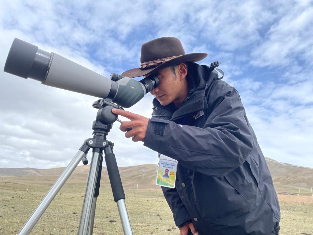 5月21日,昂旺才仁正在用望遠(yuǎn)鏡觀察鳥類活動。 新華社記者 李琳海 攝