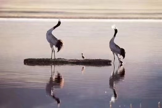 在濕地中翩翩起舞的黑頸鶴。(青海玉樹隆寶國家級自然保護(hù)區(qū)供圖)