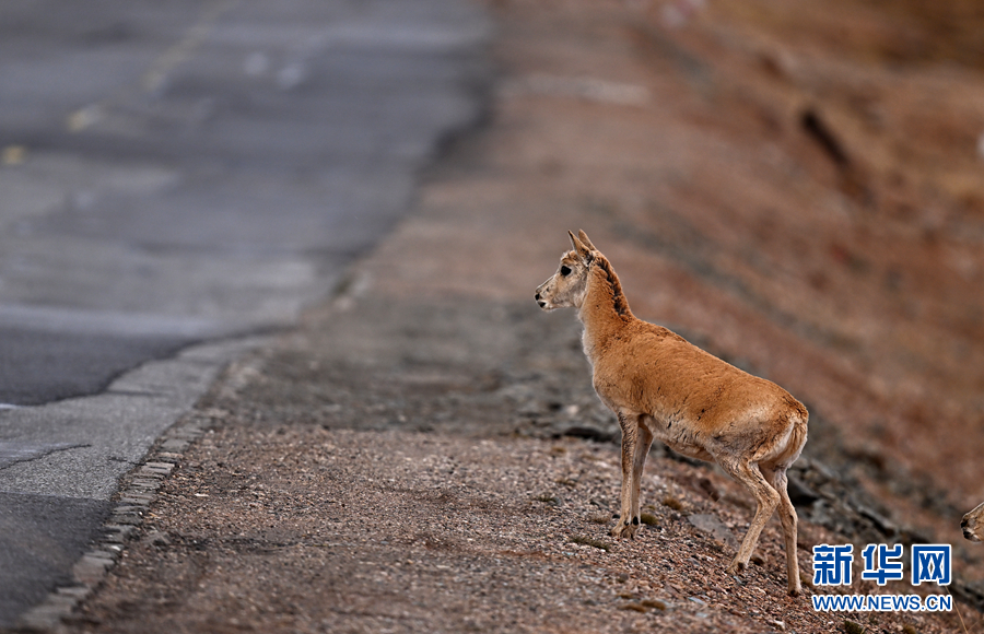 在青??煽晌骼铮恢淮菩源a(chǎn)藏羚羊準(zhǔn)備通過青藏公路。新華網(wǎng) 潘彬彬 攝
