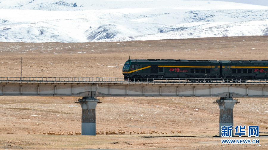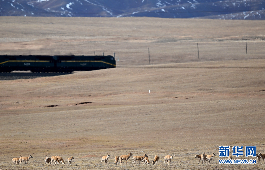 一群藏羚羊在青海省玉樹藏族自治州境內(nèi)的草原上活動,一列火車行駛在它們身后的青藏鐵路上。新華社記者 張宏祥 攝