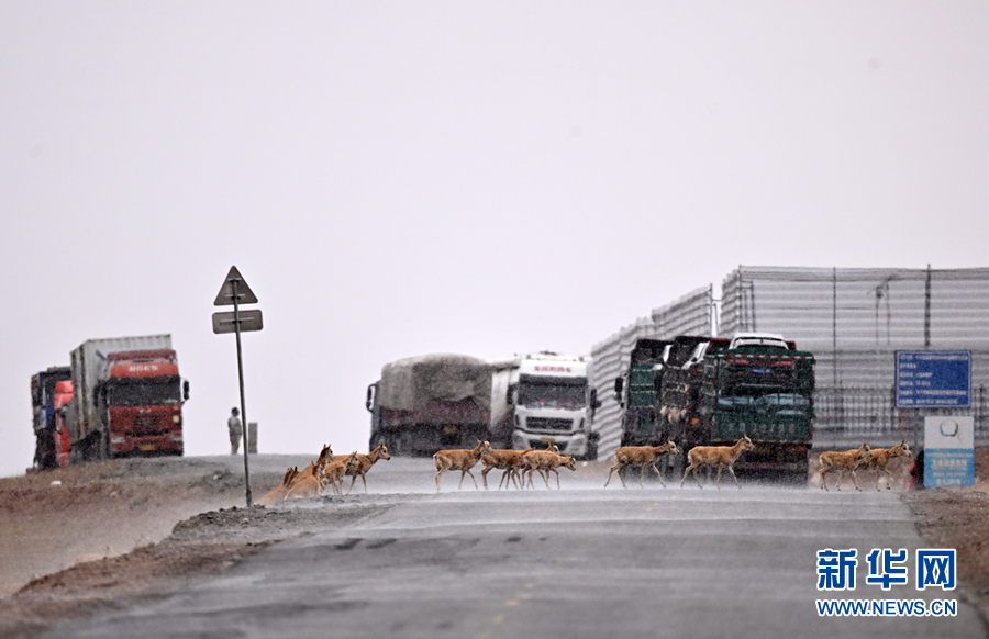 在青??煽晌骼铮蝗捍菩源a(chǎn)藏羚羊通過青藏公路。新華社記者 張宏祥 攝