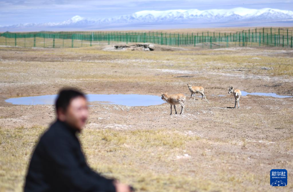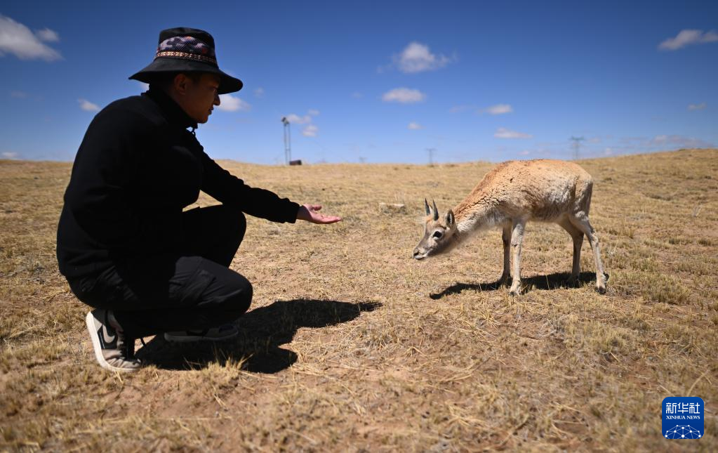 5月30日,在可可西里國家級自然保護區(qū)索南達杰保護站,巡山隊員才文多杰和藏羚羊在一起。 新華社記者 薛玉斌 攝