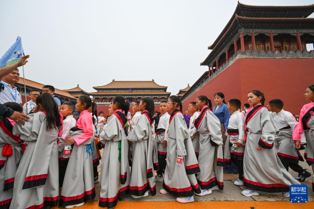 5月31日,來自青海省玉樹州的孩子們在北京故宮博物院外排隊等候進入?yún)⒂^。新華社記者 陳曄華 攝